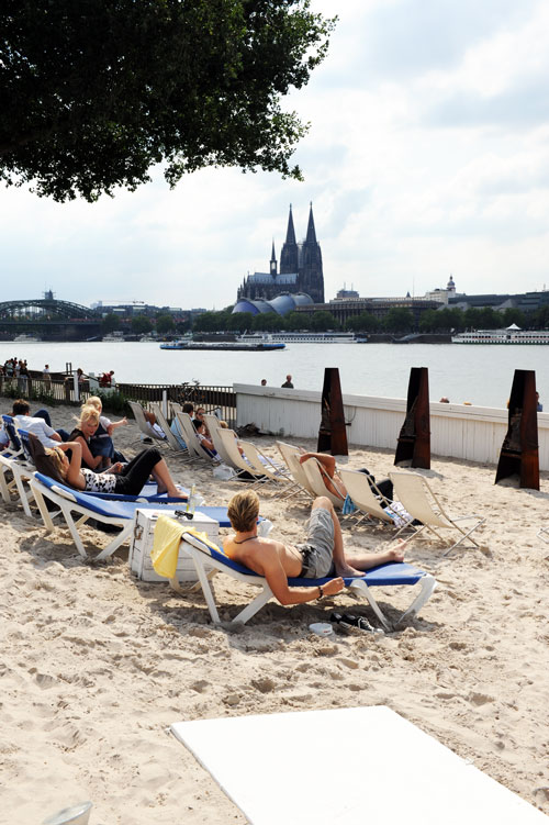 km 689 Cologne Beach Club. Chillen auf Liegen am Strand des Rheins. Macht Spaß, die Aussicht ist super und die Preise ganz ok. Und das Bild oben hat eine kuriose Vorgeschichte.