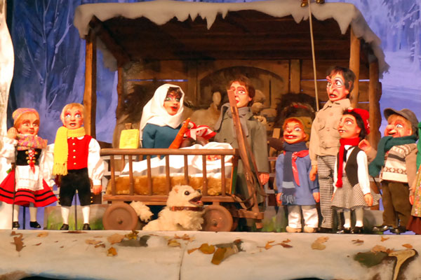 Doch die satirischen Seitenhiebe gehören bekanntlich unverzichtbar zu den jährlich insgesamt sechs Inszenierungen. Ebenso die Gesangseinlagen. Eine fünfköpfige Combo begleitet auch diesmal durch das Stück. Immer wenn sich der Vorhang auf eines der insgesamt drei Bühnenbilder öffnet, gehen kleine und große Aahs durch den Saal. Die handgemalten Prospekte, der perspektivisch gemalte Hintergrund, sind mit viel Liebe zum Detail gestaltet. Insbesondere das zweite Bild, mit der verschneiten Kulisse von St. Maria im Kapitol, verzaubert die Zuschauer. Wenn dann die Lichtregie die Bühne abendlich ausleuchtet, wird es für Momente ganz still.